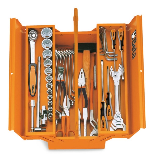 Three-section cantilever tool box, made from sheet metal